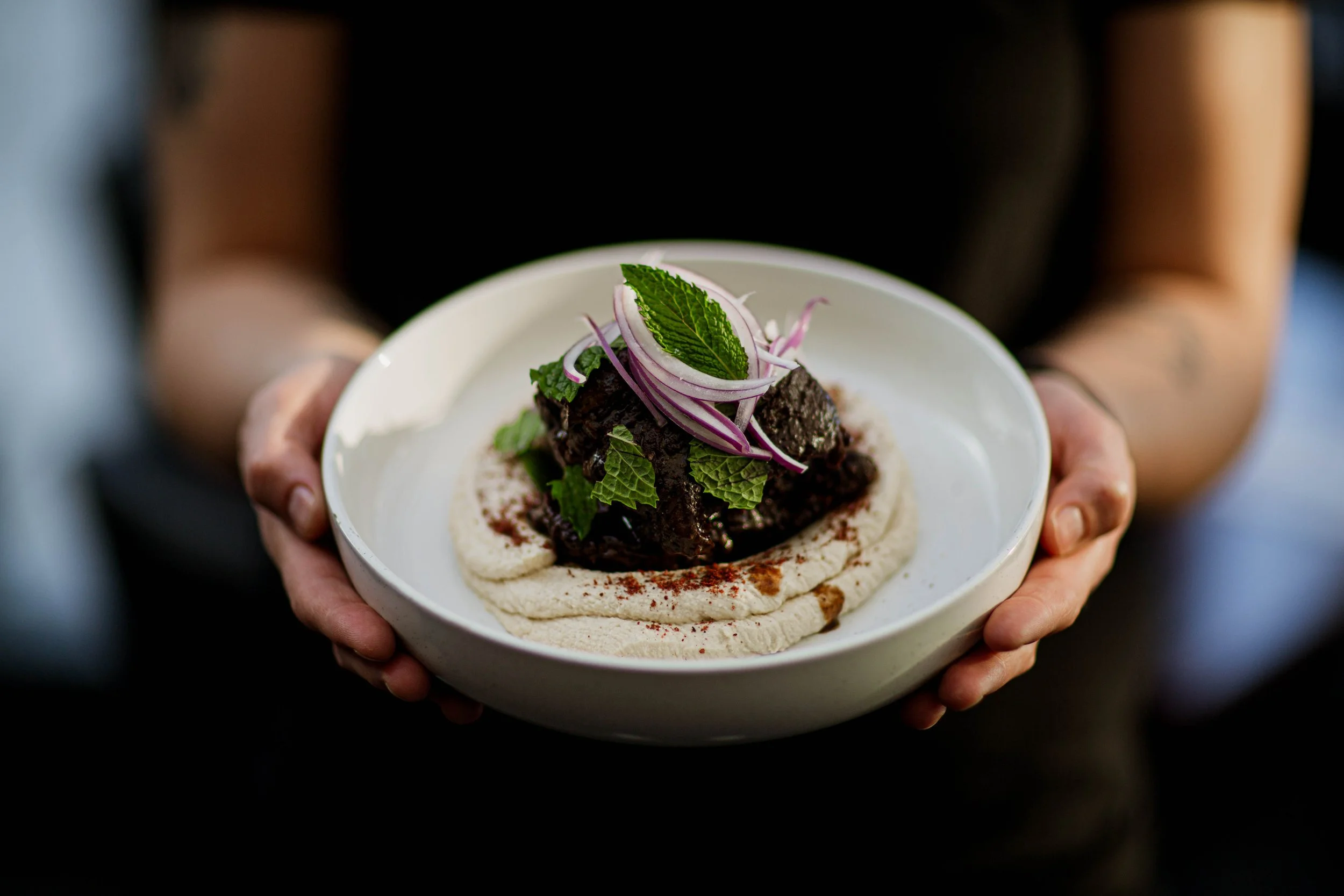 Turkish style pizza with spiced pork spread, toped with a red onion, sumac, mint salad & a lemon crema